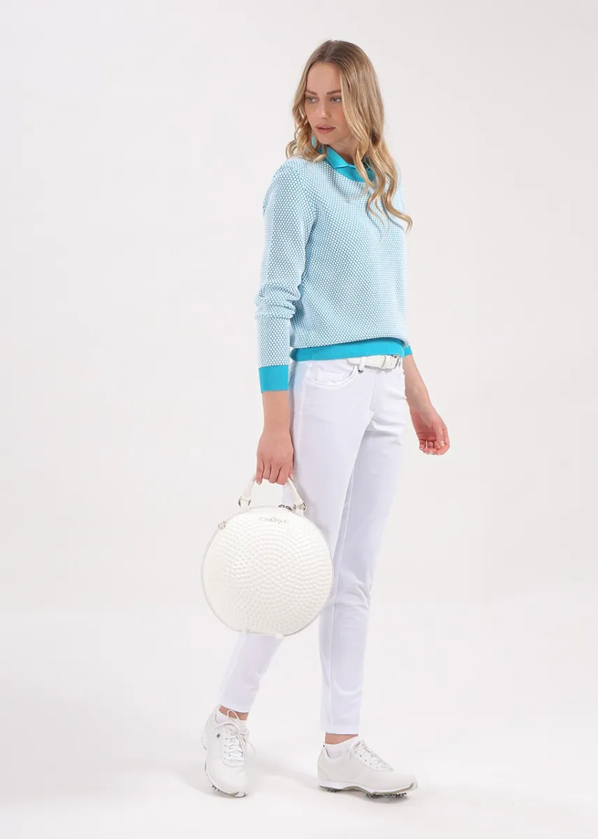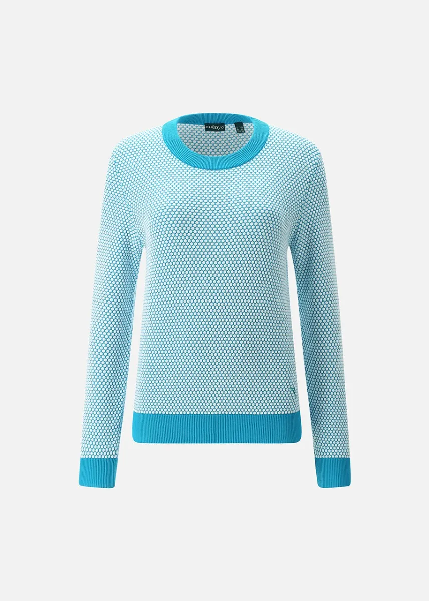 „Natura“ – tai moteriškas megztinis  tekstūruoto medvilninio audinio, kuris užtikrina šilumos komfortą ir pralaidumą orui. Taisyklingo kirpimo megztinį puošia vienspalvė briaunų trikotažo iškirptė ir rankogaliai. Fone išsiūtas logotipas