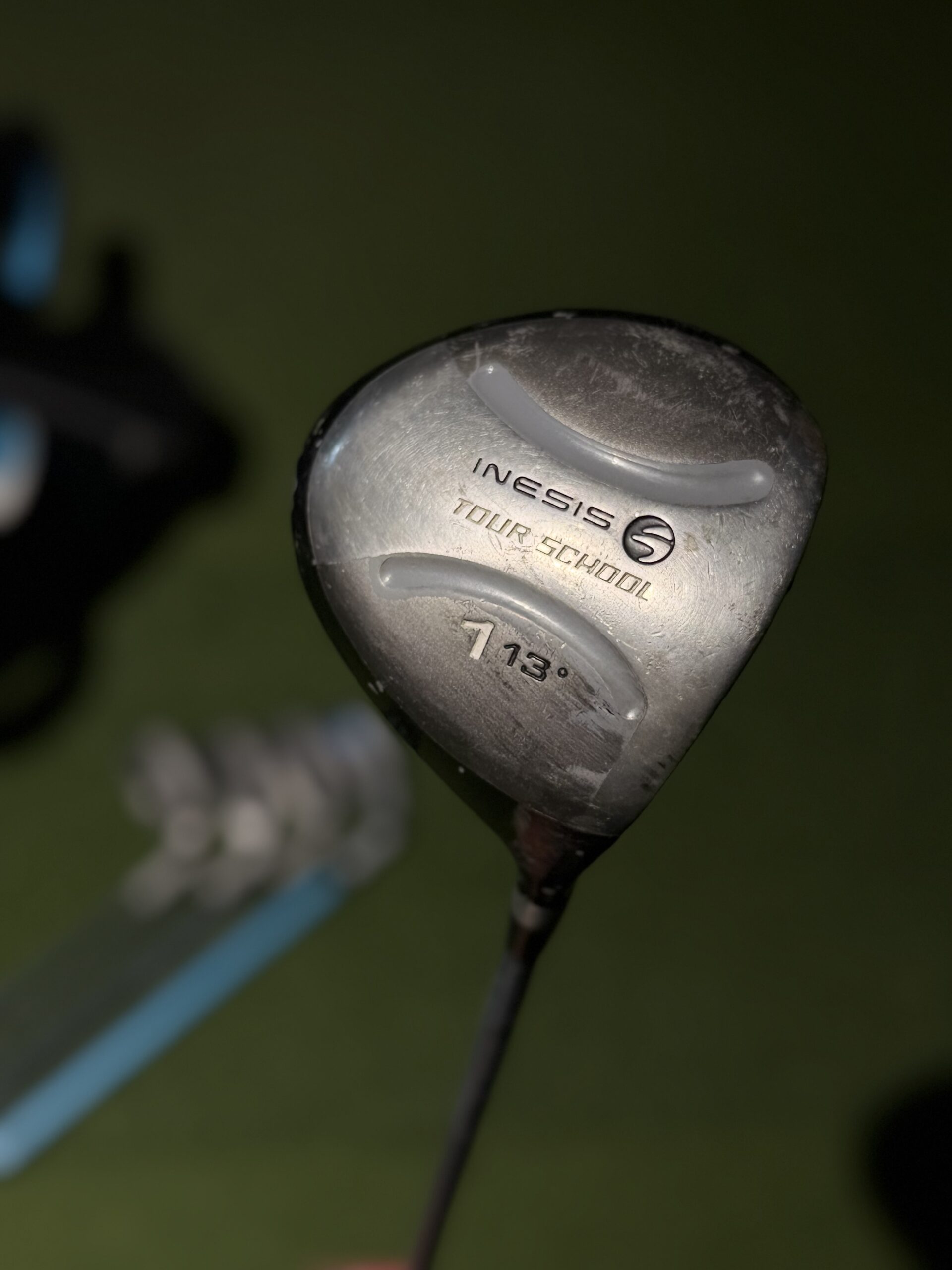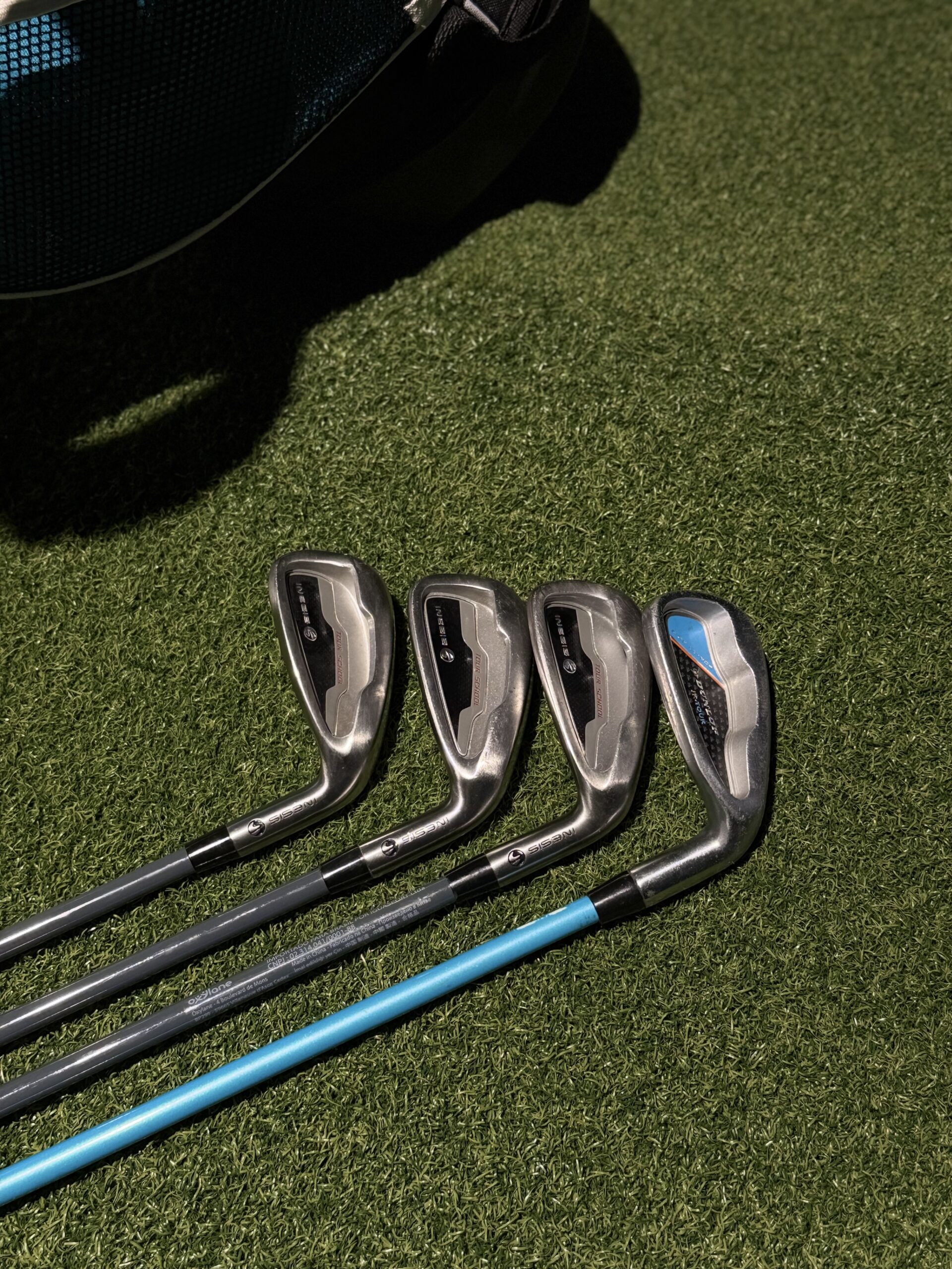 Lazdos: Driver (13°), 7 iron, 2x 9 iron, SW, Putter